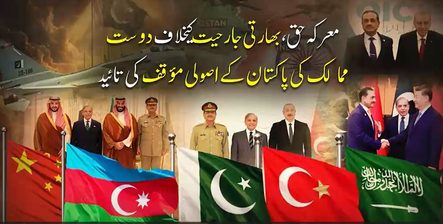 اسلام آباد: بھارت کی بلا اشتعال جارحیت اور جنگی جنون کے خلاف پاکستان کے دوست ممالک نے سفارتی میدان میں "آہنی دیوار” کا روپ دھار لیا ہے۔ چین، ترکیہ، سعودی عرب اور آذربائیجان نے پاکستان کے اصولی مؤقف کی مکمل تائید کرتے ہوئے اسے حق اور سچائی کی فتح قرار دے دیا ہے۔