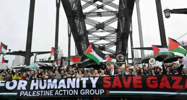 سڈنی : غزہ میں اسرائیلی مظالم کے خلاف آسٹریلیا کے شہر سڈنی میں شدید بارش کے باوجود ہزاروں افراد نے ہاربر برج پر مارچ کیا اور فوری جنگ بندی اور انسانی امداد کی فراہمی کا مطالبہ کیا۔