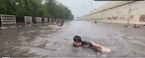 نئی دہلی کی سڑکیں طوفانی بارشوں سے ندی نالوں کا منظر پیش کرنے لگیں، نوجوانوں کی پانی میں چھلانگ اور تیراکی کی ویڈیو وائرل